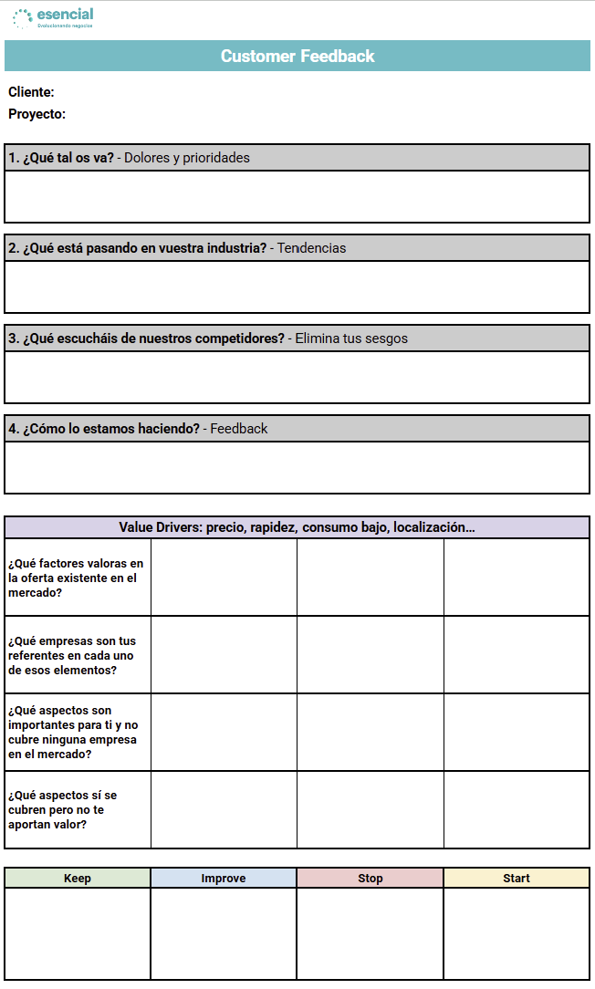 Una plantilla con 8 preguntas para hacer a clientes y entender mejor qué valoran para mejorar nuestra propuesta de valor.